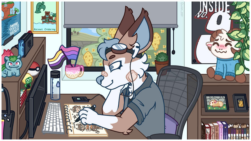 Hi, I'm Quinn, and my pronouns are They/She (strong preference for They/them pronouns, but she/her is chill).I'm Bisexual and Non-Binary, living in the England.I'm an artist an animator, mostly posting fanart, but I sometimes draw my OCs - especially my Fursona (a Jerboa named Harper) and story-based character Chalk (a Satyr).